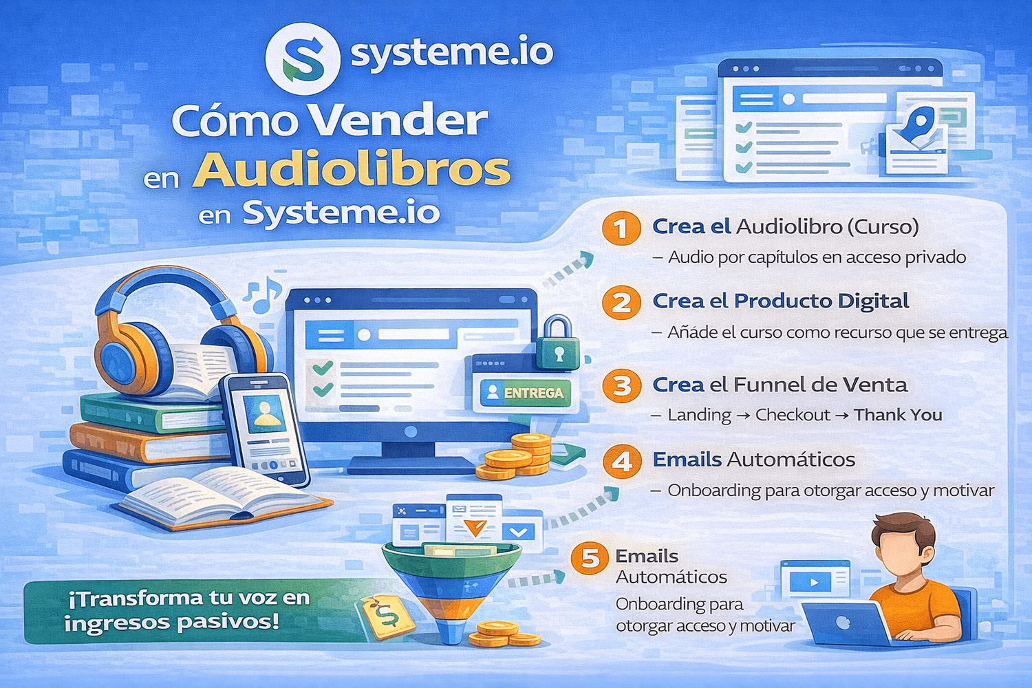 Paso a paso para vender audiolibros en Systeme.io, tanto si quieres entregarlos como acceso privado (tipo “biblioteca”) como si prefieres descarga / escucha en página.
